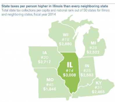 Illinois, as a % of Gross State Product, spends 5% above national average and taxes 10% below. The 2014 collections reflect the tax hike which was an attempt to make up for the low tax rate of 3.75. In 2011 Illinois per capita income was 22% above the surrounding 6 states cited, but taxes were only 5% above the average of those 6 states. Yeah, repaying pension shortages does cost money.