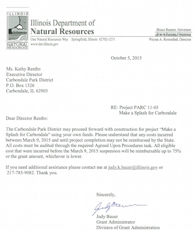 UPDATE- Has Carbondale received any monies from the IDNR grant since 2011 when they received word of approval? If not, it looks like a $2.5 million dollar grant just became a $1.875 million dollar grant (75%) that used their $625,000 match in the calculation.