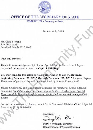 A smaller quibble: Shouldn’t the use of public places in Illinois be limited to groups actually based in the state or having a local affiliate or chapter? The address indicated that this group is from Florida.