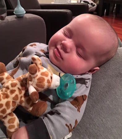 Adorable little man! This looks like the pictures I took of my child the night before returning from maternity leave: baby asleep on my lap, empty wine glass in the background…