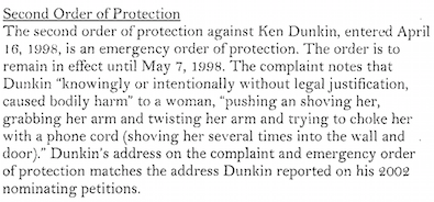 According to documents provided by Alderman Reilly, Dunkin was convicted of violating orders of protection battery and sentenced to probation. But the victim in the 1996 case, who wished to remain anonymous, said the charges were exaggerated.