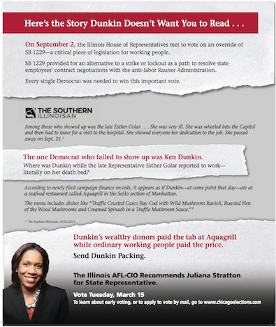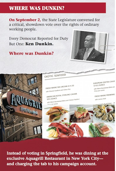 * Political Flyer Dredges Up Rep. Dunkin’s Previous Trouble With The Law: He says local Mike Madigan Democrats are out to get him because he’s broken with the House Speaker on some key issues. “It’s unfortunate, but this is the depths that they’ll stoop to because they’re so desperate and so thirsty to discredit me, because I’m my own man,” Dunkin says.