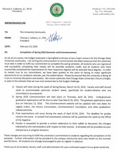 Those students who are not graduating this year ought to be thinking about transferring to UIC or some other nearby college. CSU may not be around come fall semester.
