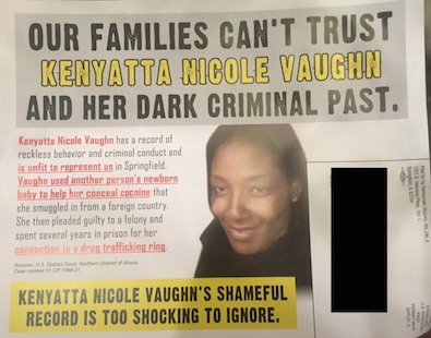 The mailer was paid for by the House Democrats, probably because Vaughn has long been rumored to be Rep. Ken Dunkin’s candidate in the 6th House District, which was formerly represented by the late Rep. Esther Golar.