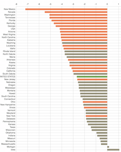 No — the second chart shows the decrease (negative) in employment rates over the period. The closer a state is to the BOTTOM of that list, the “better” it did. The only two states to show a percentage INCREASE in employment for that period were Michigan and Iowa — at the very bottom of the list. (Iowa must really be doing something right)