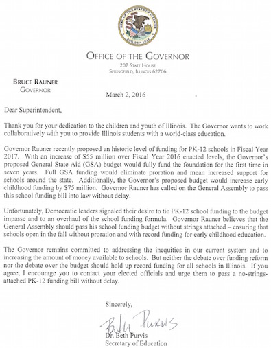 Bruce Rauner feels a need to send a letter out to cover himself when our education system collapses completely. Because he won’t do his job. Because he doesn’t seem to understand what his job is. Because he thinks he can political win at everyone else’s expense be it Republican, Democrat, liberal, conservative or a migrating prairie chicken.