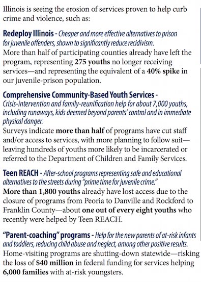 Other law enforcement advocates said youth crime-diversion programs are serving fewer teens because they haven’t gotten state funding since last summer. More than half of the state’s counties that participate in Redeploy Illinois, which provides counseling to teens at risk of incarceration, have left the program, affecting almost 300 youths who would have been served, according to a survey by Fight Crime: Invest in Kids. The survey also found that about 1,800 youths no longer have access to after-school programs and that community-based centers that help runaways have cut staff.