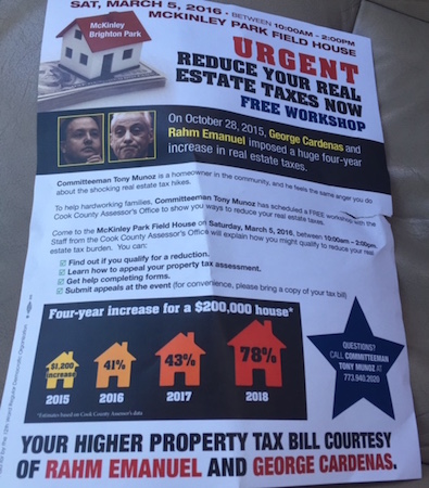Lopez’ comments referred to a flyer distributed by Muñoz’ 12th Ward Democratic Organization promoting a property tax rebate seminar scheduled for this Saturday at the McKinley Park Field House, the same location as the 12th Ward’s early voting polls.