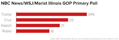 * For context, the Tribune poll (March 2-6) had Donald Trump leading with 32 percent, Cruz at 22, Rubio with 21 and Kasich at 18 with 7 percent were undecided. The We Ask America poll (March 7-8) had Trump at 33, Cruz with 20, Kasich at 18, Rubio with 11 and 16 percent undecided.