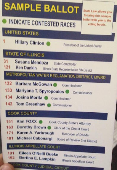 I was handed a sample Dem ballot which had Anita Alvarez’s name crossed out. But they obviously had to be reprinted at some point, because Jacob Meister’s name was included, not Dorothy Brown’s.