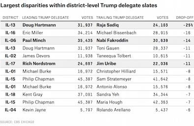 In the western Chicago suburbs, a Trump delegate candidate named Nabi Fakroddin received 14 percent fewer votes than a member of the same Trump slate named Paul Minch. In southern Illinois, a would-be Trump delegate named Raja Sadiq received an eye-popping 25 percent fewer votes than a slate-mate named Doug Hartmann. And in a rural western Illinois district, a losing Trump delegate named Jim Uribe received 11 percent fewer votes than one named Rich Nordstrom.