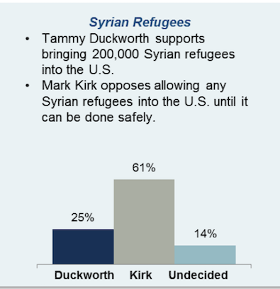 Duckworth flatly denies she ever said she wanted to accept 200,000 Syrian refugees, but a recent WaPo article on the topic quotes some Chicago reporters as saying she did. Duckworth may have misspoken, but whatever. I don’t expect Kirk to ever give up on that one.