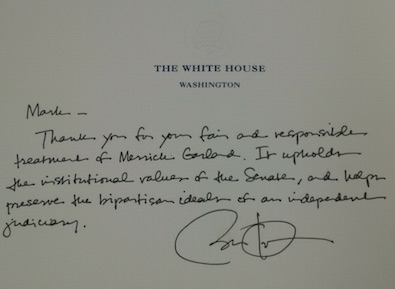 * This note from President Barack Obama to US Sen. Mark Kirk about Kirk’s recent meeting with Supreme Court nominee Merrick Garland was sent to me last night by the Kirk campaign…