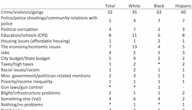 “Crime/violence/gangs” vastly tops every other issue across every racial demographic. “Police/police shootings/community relations with police,” barely registers. They appear to be more upset at the cops for not protecting them from criminals than anything else.