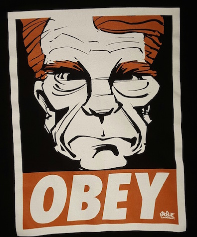 For everyone confused by the t-shirt logo, it is a parody of Shepard Fairey’s “OBEY” design (featuring Andre the Giant’s face). Fairey is arguably more famous for his Obama “HOPE” design though.