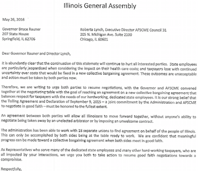 Late yesterday AFSCME Council 31 executive director Roberta Lynch received a letter also addressed to Governor Bruce Rauner from seven Republican state representatives (Avery Bourne, Adam Brown, Terri Bryant, CD Davidsmeyer, Norine Hammond, Don Moffitt and Sara Wojcicki Jimenez) urging both parties to resume negotiations for a new collective bargaining agreement for state employees.