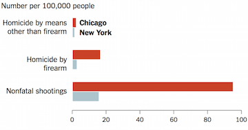 The homicide rate in Chicago is just a little higher than in New York when guns aren’t involved. But when it comes to shootings, both fatal and not, Chicago stands out, suggesting a level of armed interaction that isn’t happening in New York.