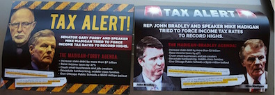 I live in the Western Suburbs and got a mailer today about my State Senator-Tax Hikes, Debt & Dirty Politics was the banner-Kind of odd as the fonts are different as are the colors-not to mention that the sources they cite are from publications way south of the western suburbs.