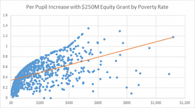 First, the (as-yet-unseen) bill would give every school district the same amount as they received last year through the formula. Then, $250 million would be distributed through an Equity Grant, which would flow to districts based on their poverty concentration. Finally, every district would get at least what it would have received if the formula were fully funded next year, even if the first two pieces didn’t get them quite there. My math shows the total increased cost would be $328 million.