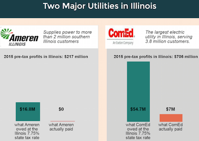 Illinois has a corporate income tax of 7.75 percent. Had Ameren Illinois and ComEd paid the full rate, the state government would have had an additional $65 million in revenue last year, according to IPS.