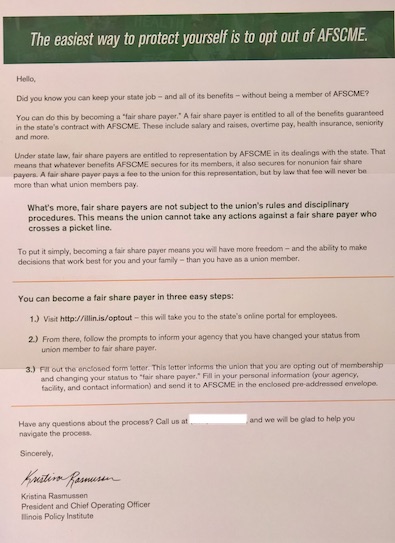 I’m a regular reader of the blog and an infrequent commenter. Not sure if you’ve seen this yet but the Illinois Policy Institute is trying to get AFSCME members to resign their membership to “protect” themselves from “the union’s rules and disciplinary procedures.” I’ve attached pictures of the cover letter they sent and the resignation letter they’re encouraging us to send to AFSCME.