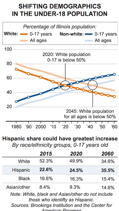 In Illinois, the children of first and second generations of Mexican immigrants who moved to the state throughout the 1990s are bolstering the Hispanic population, as Hispanic children are expected to make up 25 percent of the state’s child population by 2020, projections show. That same year, just under 50 percent of Illinois children will be white, about 16 percent of children will be black and about 9 percent of children will be Asian, multiracial or of another race. By 2060, the number of white children in Illinois will slip to about 35 percent, projections show, while the number of Hispanic children will rise to 36 percent. Black children will be at about 15 percent and Asian, multiracial and other nonwhite children at about 15 percent.