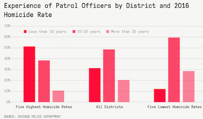 The average officer in the 11th joined the force 10 years ago; over a third of the district’s officers have less than five years on the force. Meanwhile, most veteran officers with patrol experience in the late 1990s — the last time Chicago’s murder rate was as high as today — work far from Garfield Park. Half a dozen miles to the north one of the city’s safest districts, Jefferson Park, has only three officers with under 10 years of experience. Over half the patrol officers are 20-year veterans.