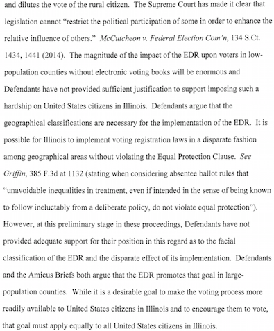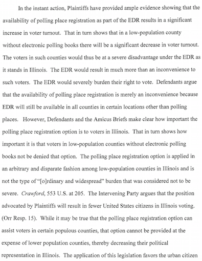 Also - MrJM - is not wrong in the analysis of the Judge’s words. Still, similar arguments have been used to support restricted hours or fewer polling places in areas with large minority populations. Those arguments would rightly be rejected, as should allowing EDR on different terms in different counties in Illinois.