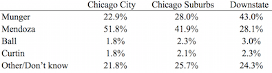 Mendoza is leading in the City of Chicago at 52 percent compared to Munger’s 23 percent. Downstate the incumbent, Munger, is leading by 43 percent compared to Mendoza’s 28 percent. The balance of power is held in the Cook county suburbs and collar counties where Mendoza is leading by 42 percent to Munger’s 28 percent.