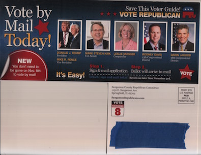 ===The Sangamon County Republican Party sent fliers to mailboxes in Springfield on Saturday soliciting vote-by-mail for the GOP ticket, political literature that featured Trump===