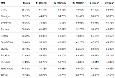 @ILPundit, I’m not sure population density is the best rationale here. In the St. Louis media market, where population density is probably just as good as Rockford or Peoria, Trump did 7 points better that Romney and Bush.