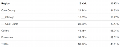 Kirk’s numbers were just horrible. I wonder if Governor Rauner regrets clearing the decks and paving the way for Kirk to run without serious competition.