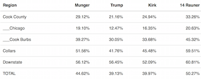 Hard to tell if what Munger lacked this cycle was help from Rauner at the top of the ticket. One could as easily see Munger as representing Rauner’s current position with the state-wide audience.