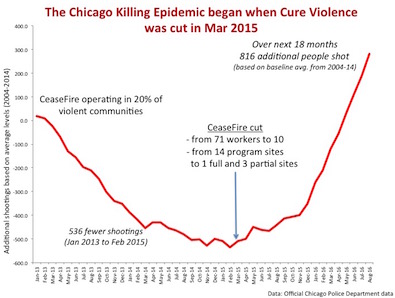 As the analysis shows, increase in shootings and killings in Chicago began in early 2015 and coincide in time with the cut in state funding of CeaseFire in March 2015 that resulted in the closure of most of the sites and a laying off of most of the workers. Before the cut, CeaseFire programs were operating in 14 communities in Chicago with 71 workers and averaging 81 mediations per month. After the cut, there was only one full site and 3 partial sites with 10 workers.