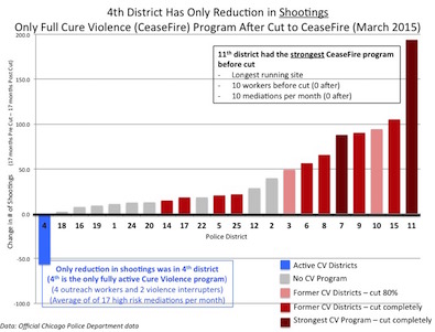 The districts where the CeaseFire programs were cut are the districts where violence increased the most, accounting for 94% of the total citywide increase in shootings. In particular, the 11th district—where CeaseFire operated its longest running program with 10 experienced staff before the cut—were two times greater than the district with the next highest total. This staff was ediating an average of 10 high risk conflicts per month before the cut. The 4th district was the only district that had reductions in shootings and killings (57 fewer shootings and 6 fewer homicide than the mean baseline). The 4th district is also the location of the only CeaseFire program that had full staffing after the cut in funding. These workers are mediating an average of 17 conflicts per month, which independent evaluations have surgested is a key element to reducing shootings and killings. There are several other control methods as well that are required to have a full program.