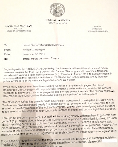 As for social media, I find myself being not quite as optimistic as Guzzardi. Here’s a memo distributed to Madigan’s members during the veto session. Click the pic for a better image…