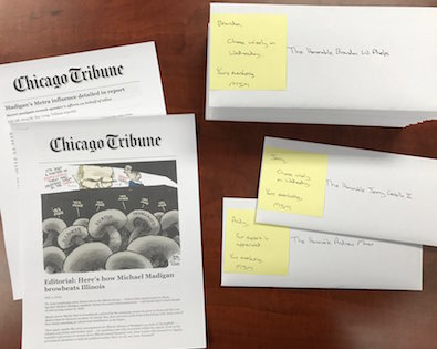 The envelope will contain the Chicago Tribune’s scathing report and editorial about Boss Madigan’s use of post-it notes to inappropriately direct hiring decisions at Metra through “ward-style patronage”.
