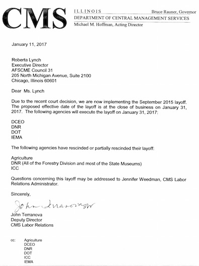 This is Rauner’s answer to Lynch’s AFSCME’s proposal. And the layoffs will not end on 1/31…..
