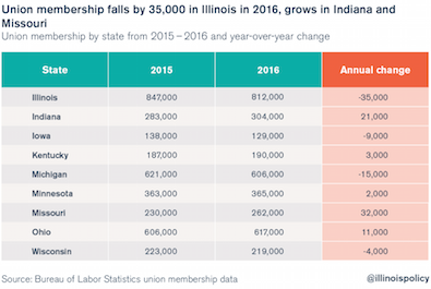 Union membership in Illinois is declining. In 2016 alone, union membership fell by 35,000 in Illinois, the worst loss in the region.