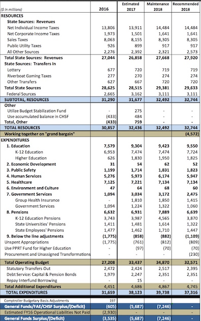 “Rauner’s budget instead includes a $4.57 billion line-item titled “working together on ‘grand bargain.’”