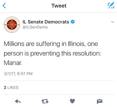One person? That’d be our Failed IL Governor who got the Repubs to Sell Their Souls to him, rather than representing their constituents and those who are being and have been damaged by no budget.