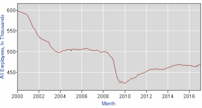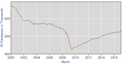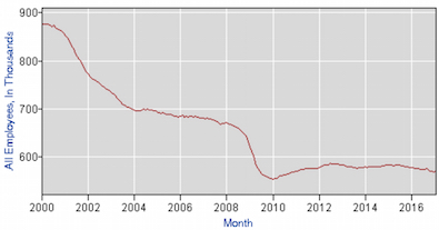 From February 1990 to February 2017, IN lost 12.5% of it’s manufacturing jobs.