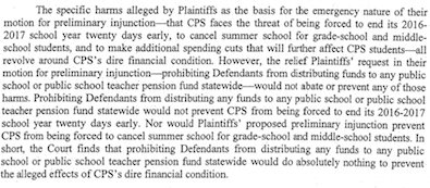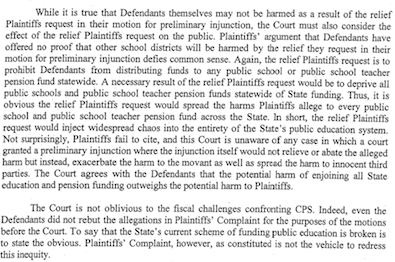 And it seems that CPS made the argument I referenced above. Nobody else should get payment until they get theirs. It’s framed in terms of “fairness” but the result is punitive. And it was strange of them to argue, as the judge noted, that nobody would be hurt by such a remedy. The goal of such a ruling would be to create chaos. Blackmail the state into meeting CPS demands by bringing the entire education system down. School funding has always pitted district against district. This is just that fight on the extreme end of the spectrum.