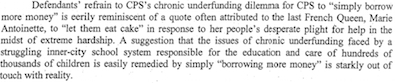 Valderrama also wrote that the state’s argument that CPS could simply borrow more money to solve its problems was “eerily reminiscent” of the “let them eat cake” comment often attributed to the last French queen, Marie Antoinette, in response to the plight of her people.