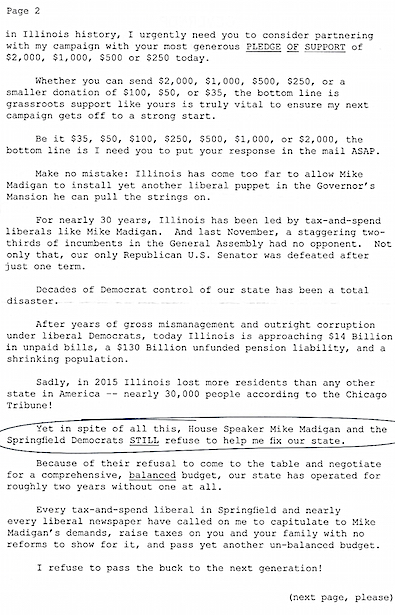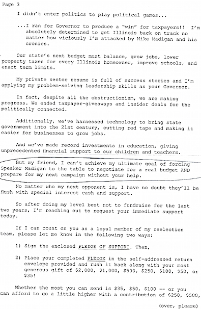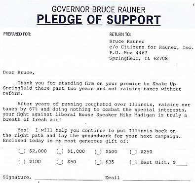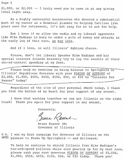 The effort is far more important than raising money. It’s more likely communication to a population of working class, middle income white men who Rauner cannot lose. So, they drop these long letters to them to give them something to talk about with the other journeymen on the line, at the bar, and the poker runs. if they give him $25, $50, $100 all the better.