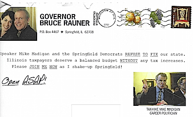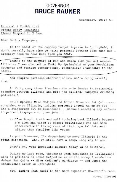 Several democratic friends of mine have received this letter. Rauner must have mailed to every registered voter! Giangreco must be advising him on his mail strategy!