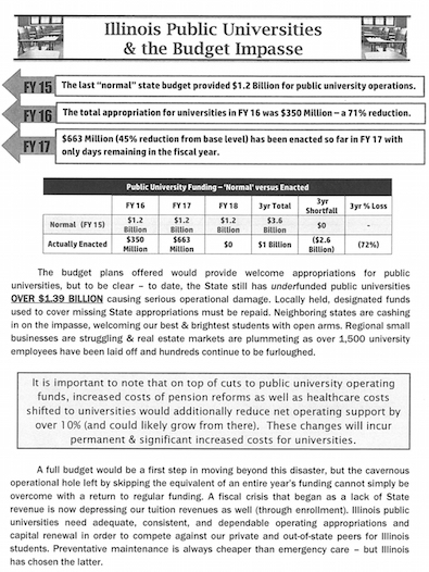 I work for a public university. We cannot fill vacant faculty lines with high quality new faculty because–surprise!–the best candidates, the ones you really need to replace distinguished high quality retiring faculty, are well aware of what Rauner is doing to the universities in Illinois and won’t come here. The result is job searches that go no where, a reduced aging faculty, and a drop in student enrollment because they want to go someplace where can be taught and work with the best and brightest faculties in the country. And that ain’t Illinois. The damage Rauner had caused to the universities of this state is long term, systemic, and will take a generation to correct. And it is intentional.