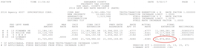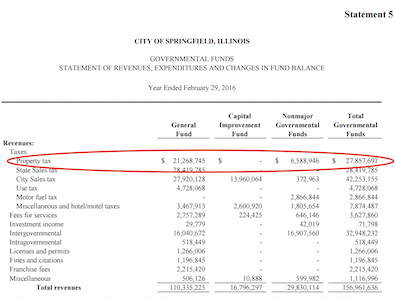 The first image is from Springfield’s FY2016 CAFR [Comprehensive Annual Financial Report] (pg. 10) showing property tax revenue of $27.9M. The second image is a Sangamon County Clerk’s Office 2016 Levy and Rate Report showing the city’s property tax extensions for pensions totaled $22M, or 80% of all property taxes paid by Springfield residents to the city. Clearly exempting pensions from a freeze will have little effect on ever-increasing property taxes.