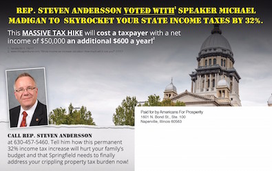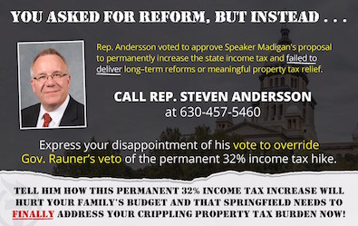 “We’re disappointed Springfield failed to provide taxpayers relief from their crippling property tax burden yet voted to demand they forfeit more money to the state by permanently increasing their income tax bill by 32%. A bipartisan majority of residents from all over the state supported a long-term property tax freeze, yet lawmakers overrode Gov. Rauner’s veto and passed the permanent income tax hike to help fuel an unbalanced budget,” said AFP-IL State Director Andrew Nelms. “This massive tax increase will cost a taxpayer with a net income of $50,000 a year more than $600 annually. Hardworking Illinoisans are already overtaxed and we want to make sure struggling families know which politicians failed to relieve their property tax burden and instead made living in the Land of Lincoln even more unaffordable.”