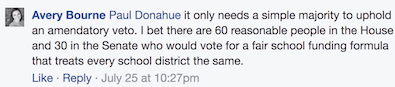 Indeed, Rep. Avery Bourne, a close Rauner ally and one of just eight education funding reform negotiators, used that very same messaging on Facebook recently…